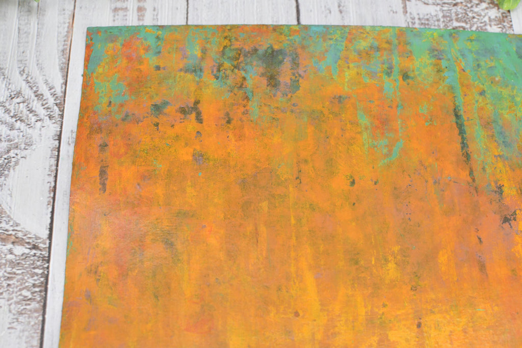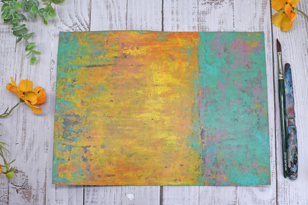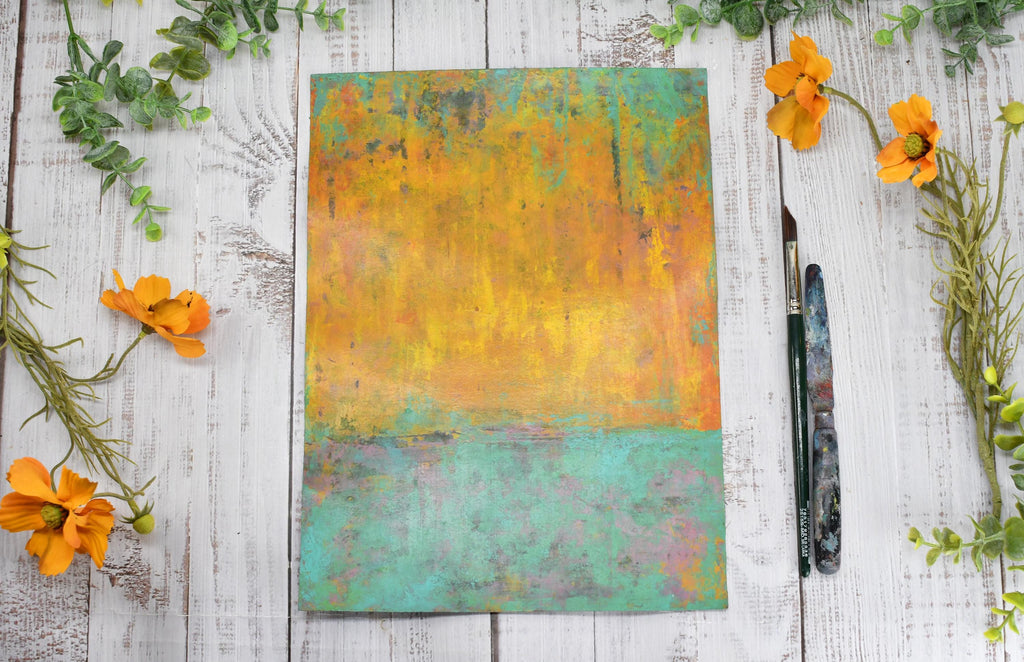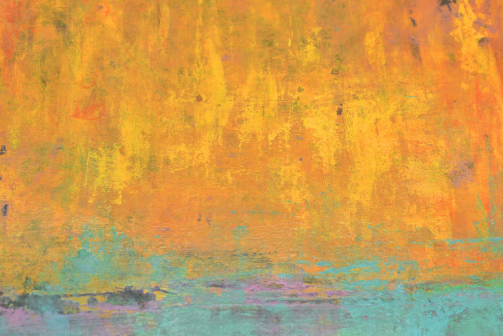 My hand-painted "Desert Sunset" art is a vibrant yellow-orange and turquoise blue-green mixed media painting on archival paper. There are charcoal gray and purple-pink areas peeking from the background. The surface is scratched and scraped and finished with archival cold wax satin patina.