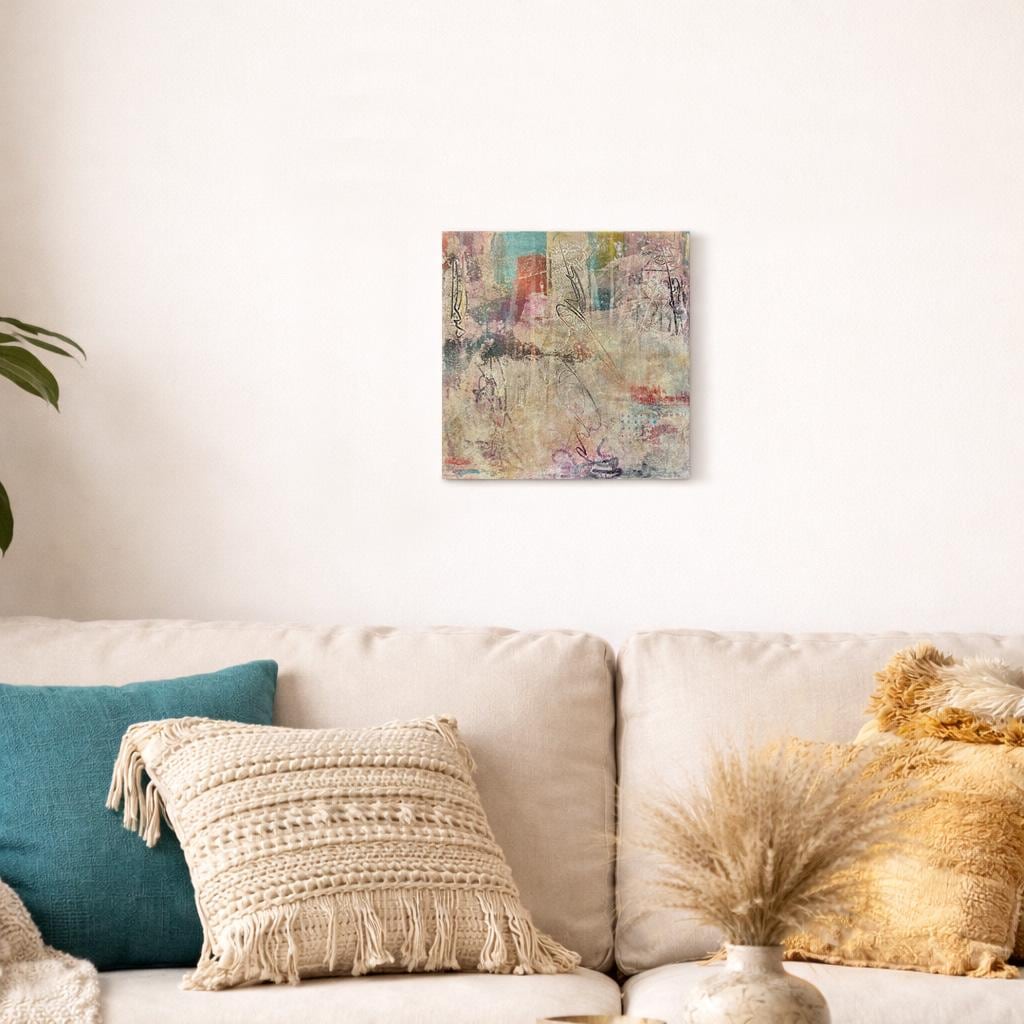 Materials: made in austin texas, woman owned small business, one of a kind artwork, rustic textured grunge painting, authentic certificate included, nonobjective intuitive artist process, display vertical or horizontal square, hand painted artwork on stretched canvas, ready to hang original contemporary wall art, modern abstract acrylic archival boho, ready to ship gift free shipping, orange teal blue black beige muted pastel.