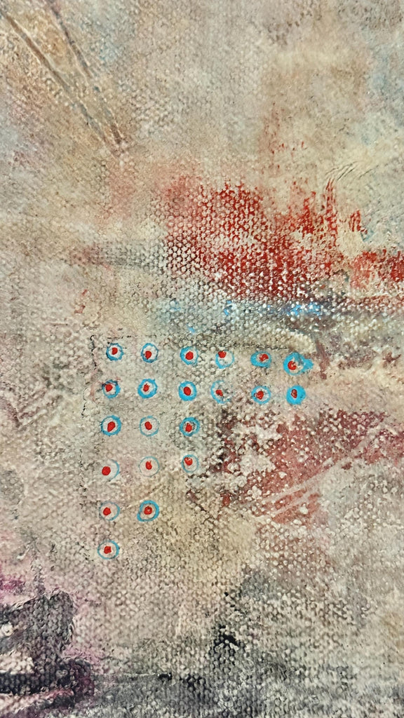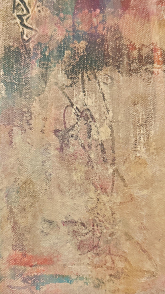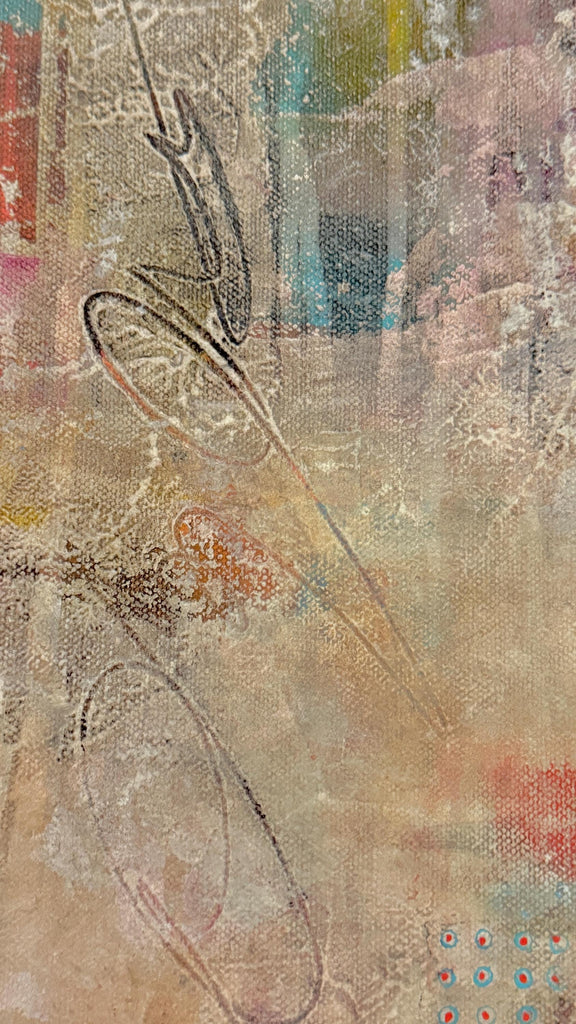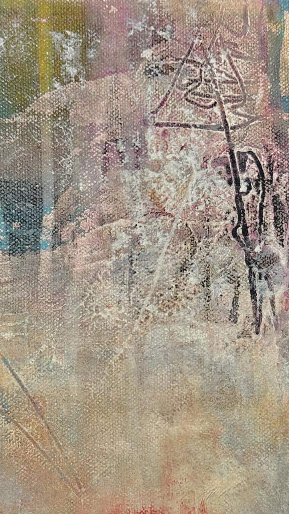 Starting a painting on canvas can be more intimidating than paper. There’s an anxiety with the substrate being more precious. I enjoy putting marks down to get started. I proceed with choosing and using paint in layers, and let intuition guide the creative process.