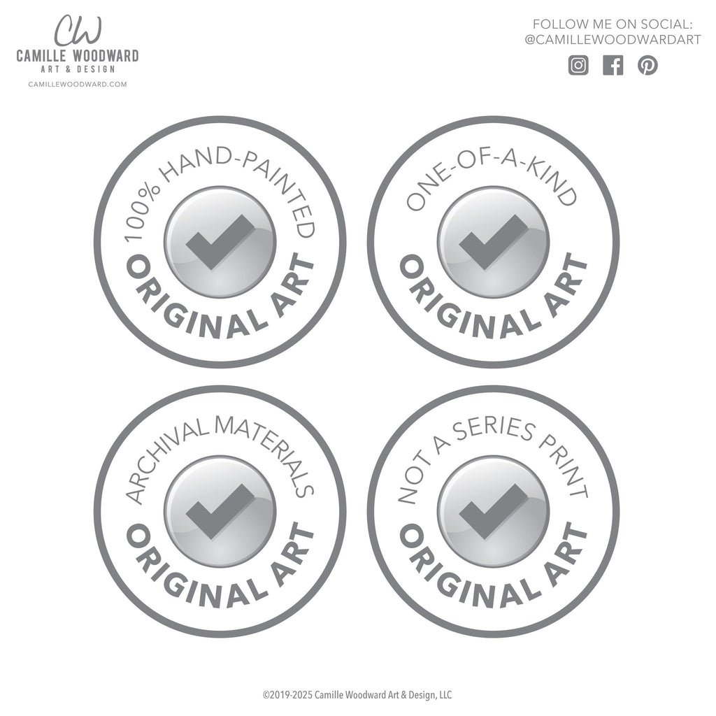 My paintings are originals and are entirely made by hand. Please be aware that there may be small drips and unexpected imperfections made during the painting process. These imperfections show the dynamism of the creative process, the artist being in a flow state, and are often unplanned. The photos try to capture any of these, if present, but please contact me if you wish to clarify any spots or drips that are difficult to discern through the photos.