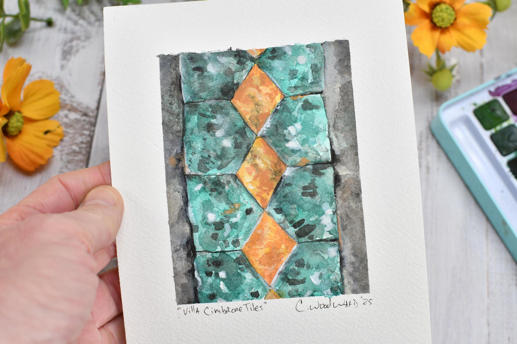 My hand painted "Villa Cimbrone Tiles" is an original watercolor painting based on the beautiful tiles in the historic city of Ravello. This small painting is approximately 5" x 7" and is signed and dated on the front. It is 100% original, one-of-a-kind and not a print.