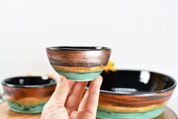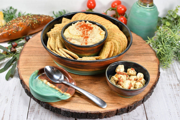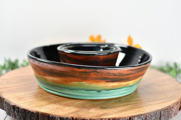 My copper, satin patina verdigris green, and glossy black glazed ceramic chip and dip bowls are beautiful and functional wheel-thrown stoneware pottery sets. Each handmade piece is hand-painted with non-toxic, lead-free glaze. A chip and dip serving snack bowl set would make a unique gift for a housewarming, birthday present, Christmas, hostess gift, and more!