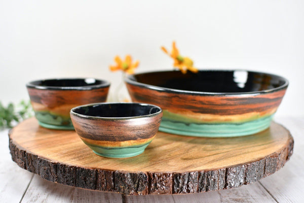 ****Photo is representative of what you will receive and may not be the exact item. Size (height/width) will vary slightly (up to 1/2"), as each item is made by hand at separate times. Each set contains three nested/detached bowls.
