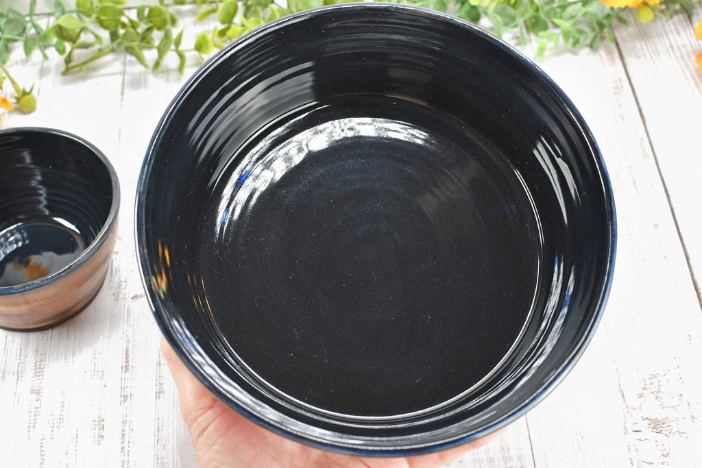 My copper and glossy black glazed ceramic chip and dip bowls are beautiful and functional wheel-thrown stoneware pottery sets. Each handmade piece is hand-painted with non-toxic, lead-free glaze. A chip and dip serving snack bowl set would make a unique gift for a housewarming, birthday present, Christmas, anniversary, hostess gift, and more!