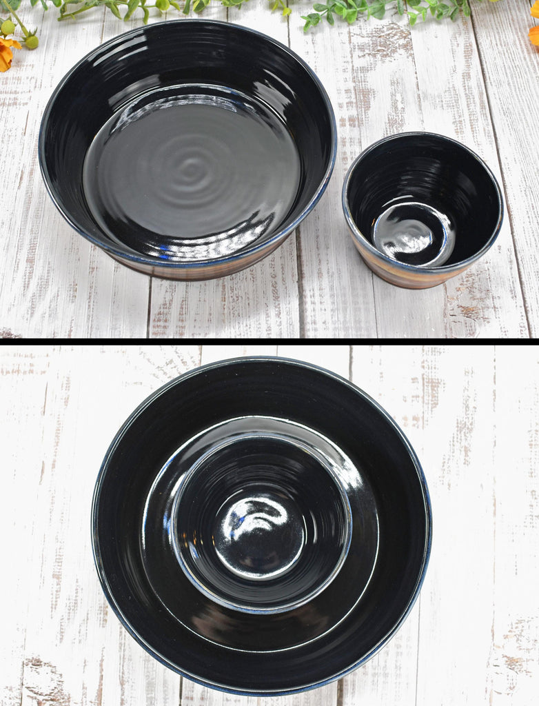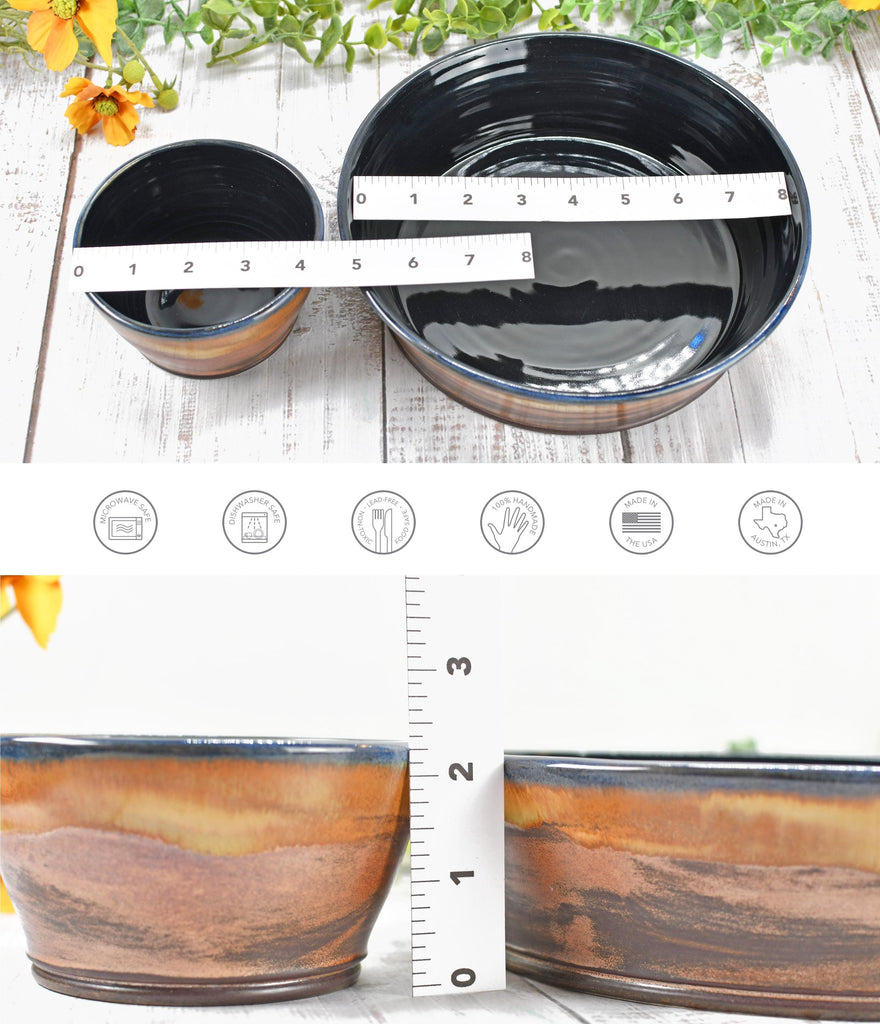 Materials: hand painted pottery, kiln fired ceramics, food safe glaze, lead free non toxic glaze, fast shipping, wrapped with care, made in austin texas USA, stoneware handmade ceramics, microwave and dishwasher safe, melted drippy glaze look, copper tan flux drippy glossy black classy, nested detached two bowls set, wheel thrown pottery dishes.