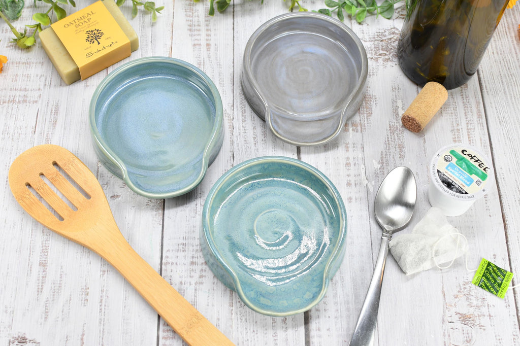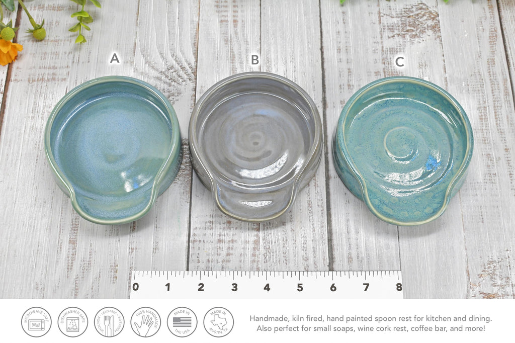 Materials: food safe lead free non toxic glaze, microwave dishwasher safe stoneware clay, wheel thrown kiln fired stoneware, large and medium stove top spoon rest, 4 to 5 inches large sturdy, handmade hand painted ceramic pottery, fast shipping ready to ship, pretty translucent ocean blue, small woman owned business, made in Austin Texas USA, Classy shiny stamped or signed, wrapped well with care and padding, teal blue green glossy lavender purple sage.