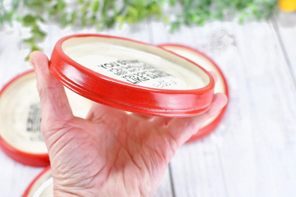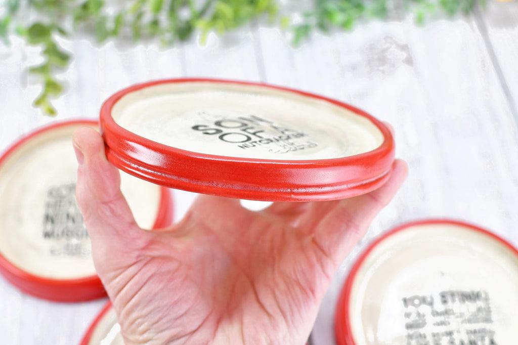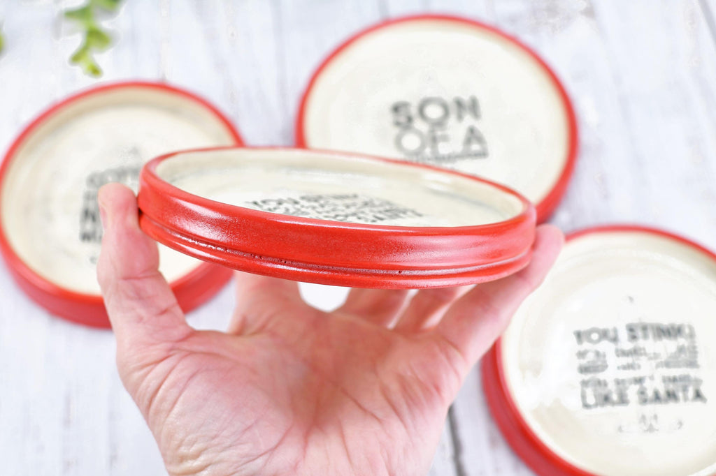 Materials: hand drawn stamped art, lead free non toxic glaze, dishwasher and microwave safe, stoneware ceramic kitchenware, handmade hand painted, food safe bright glaze, made in usa, small woman owned texas business, ready to ship, original artwork, kiln fired wheel thrown stamped pottery, red white black glaze, wine bottle drip dish spoon rest soap coffee.
