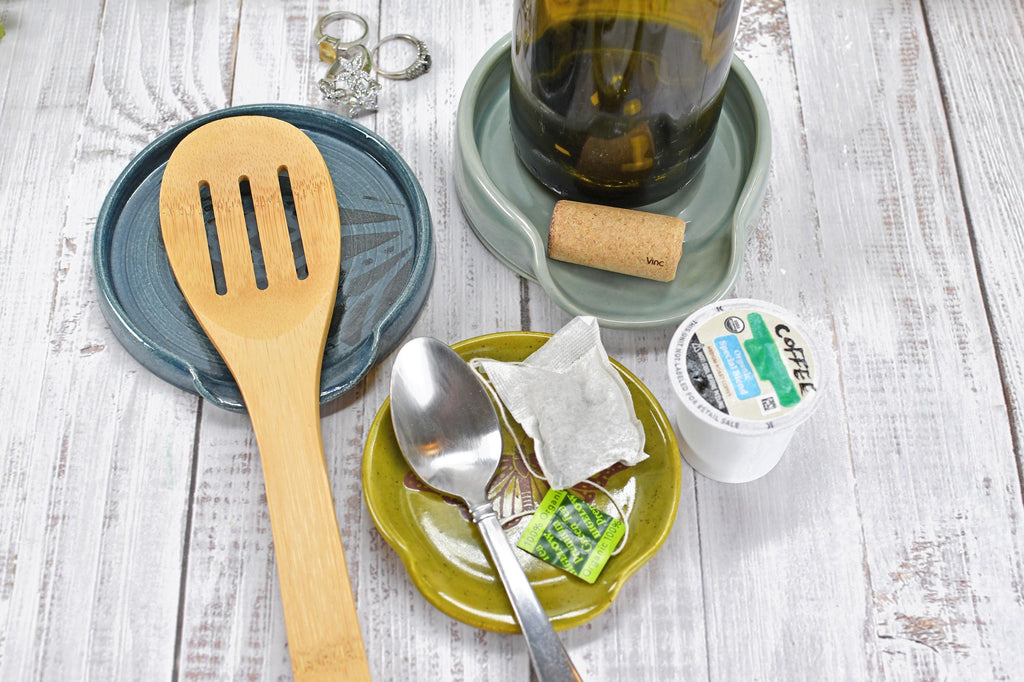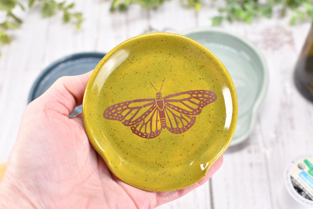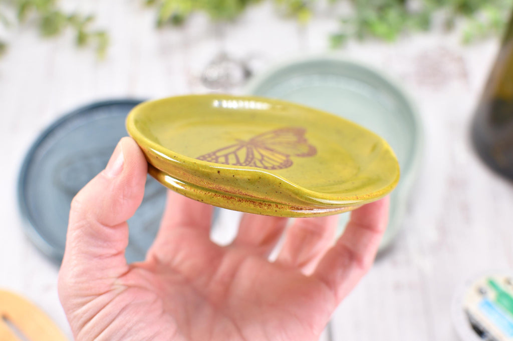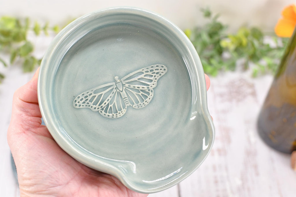 Butterfly Ceramic Spoon Rest Handmade Stoneware Pottery Stove Top Dining Soap Dish Jewelry Trinket Wine Bottle Drip Blue Green Gray Black