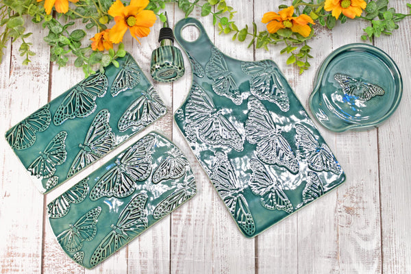 Elevate your home entertaining with beautiful monarch butterfly stamped pottery charcuterie plate, slab/flat spoon rests, or large circular spoon rest. Each of my handmade, slab-built celadon green stoneware pottery dishes will make a classy addition to your kitchen, dining, and home decor. The circular stoneware spoon rest is perfect for stovetop and is wheel thrown.