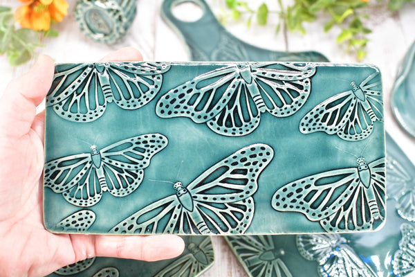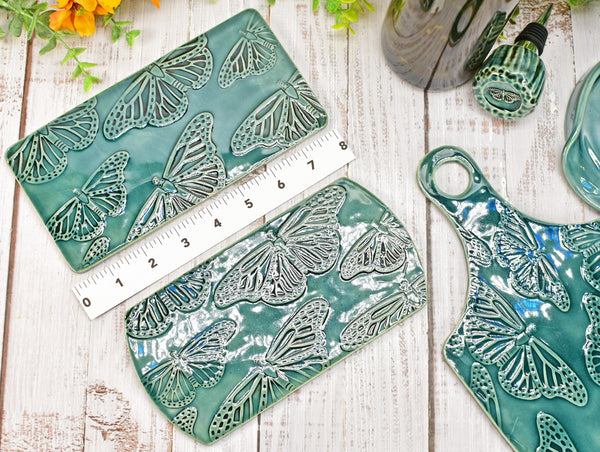Materials: dishwasher and microwave safe, lead free ceramic, handmade one of a kind, kitchen and dining serving decor, slab built stoneware pottery, monarch butterfly pattern kiln fired, spoon rest rectangle medium size, non toxic food safe transparent glaze, celadon rainforest green glossy brunch dining, made in the usa ready to ship fast, stovetop table top rustic classy stylish, snack platter wheel thrown handle hole, flat textured beautiful artisan woman owned.
