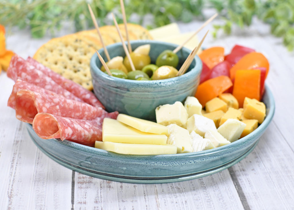 It's handmade, hand-painted with black underglaze stripes, and glossy blue non-toxic, lead-free celadon translucent glaze. Use for chip and dip serving, olives and pits, cheese and crackers, nuts, and sweet or salty snacks. Gift a unique housewarming present, birthday, Christmas, hostess, and more!