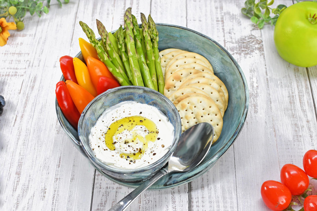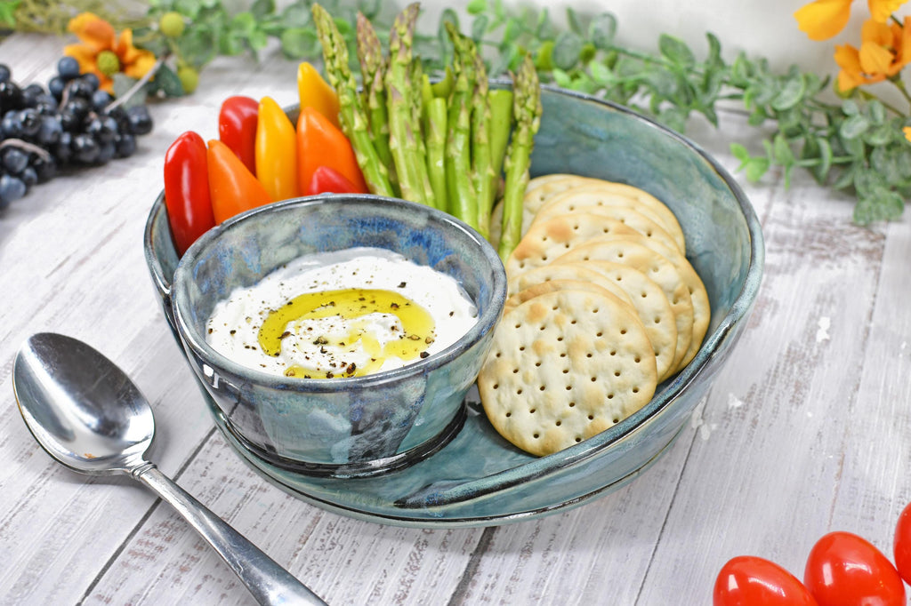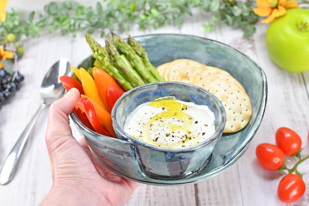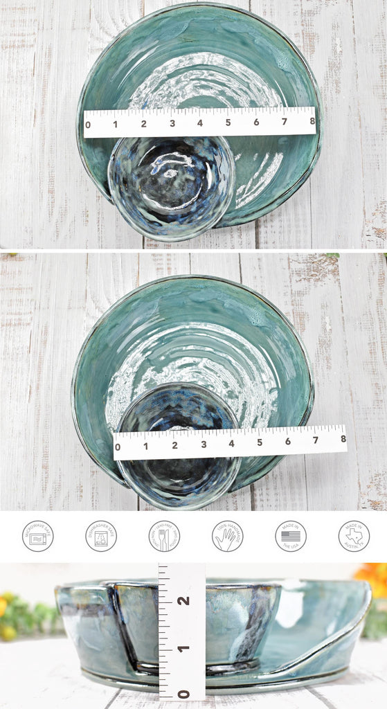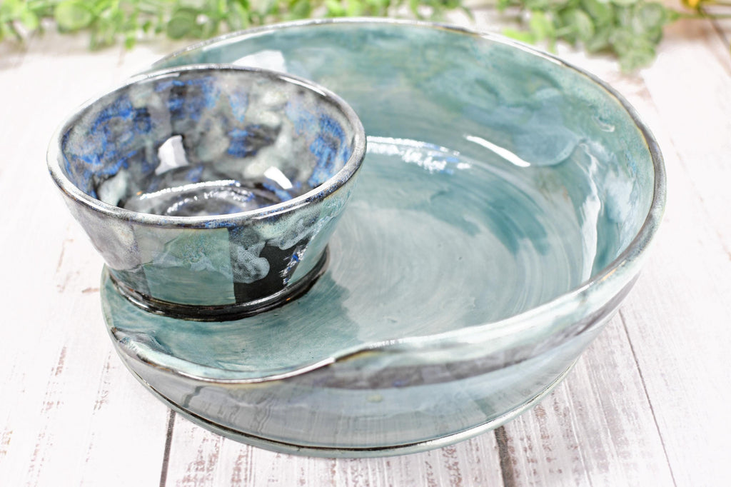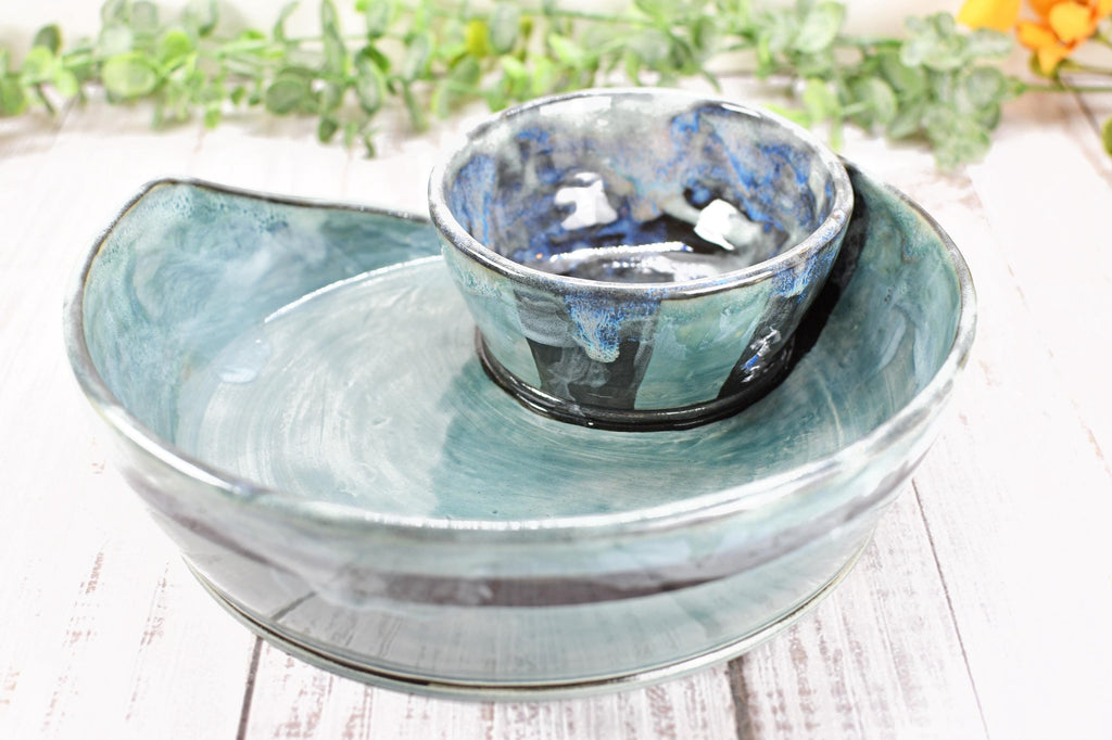 This attached ceramic chip and dip bowl is beautiful and functional wheel-thrown stoneware pottery. This handmade piece is hand-painted with black underglaze, and glossy grayish blue green non-toxic, lead-free celadon translucent glaze. Use for chip and dip serving, cheese and crackers, nuts, fruit dips, and sweet or salty snacks. Gift a unique housewarming present, birthday, Christmas, hostess, and more!