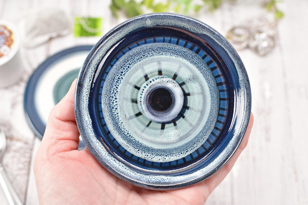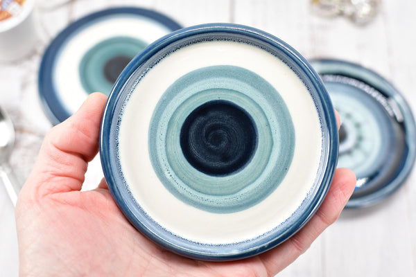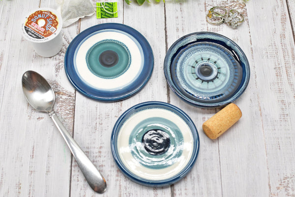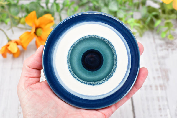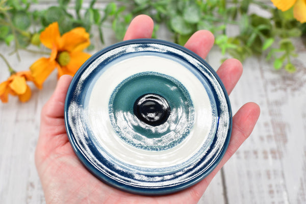 Materials: microwave and dishwasher safe, blue white teal green and black glazes, food safe non toxic lead free glaze, hand painted evil eye round circle design, kiln fired ceramic stoneware pottery, 4 inches diameter flat coaster spoon rest, small woman owned business made in USA, Austin TX artist well packaged with care, one of a kind ready to ship fast, blue white black glossy celadon glaze, handmade wheel thrown clay, glossy classy unique glaze effect, special gift for housewarming birthday.