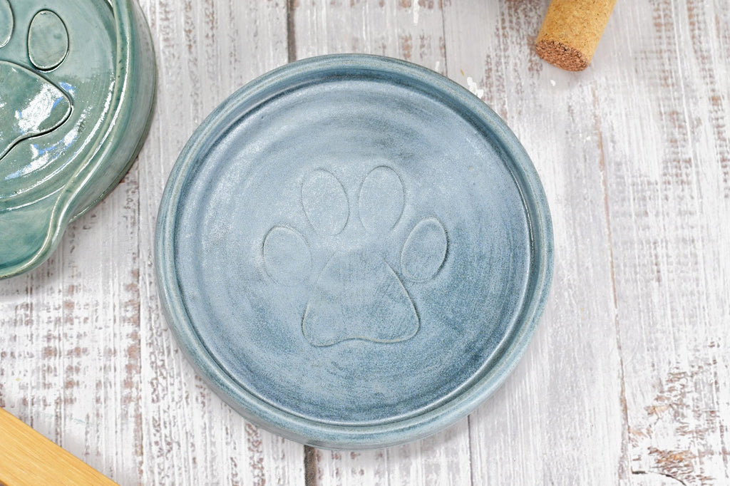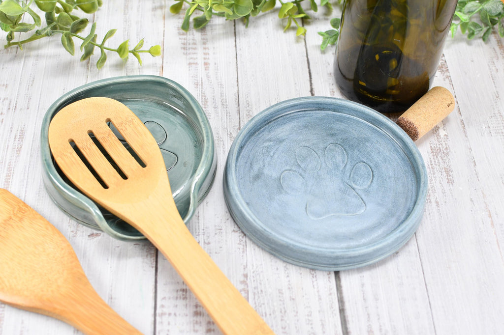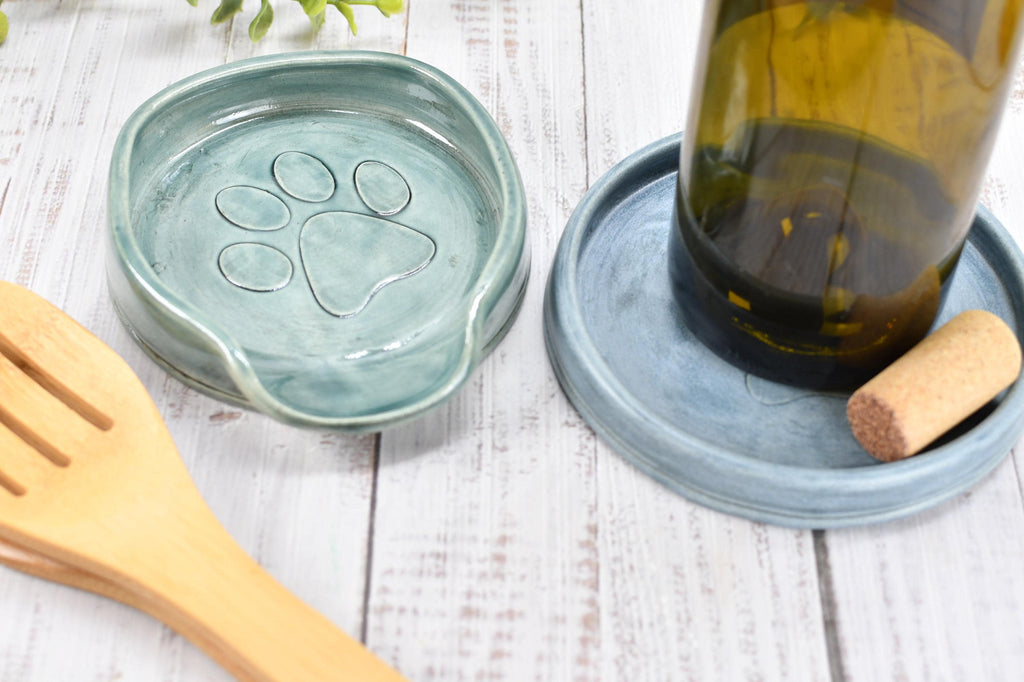 Paw Print Ceramic Spoon Rest Stove Top Wine Bottle Drip Dish Handmade Stoneware Pottery Dog Cat Animal Lover Gift Coworker Friend Mom Blue