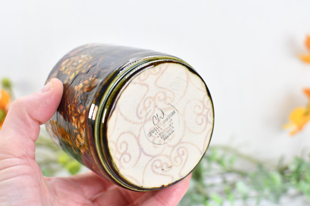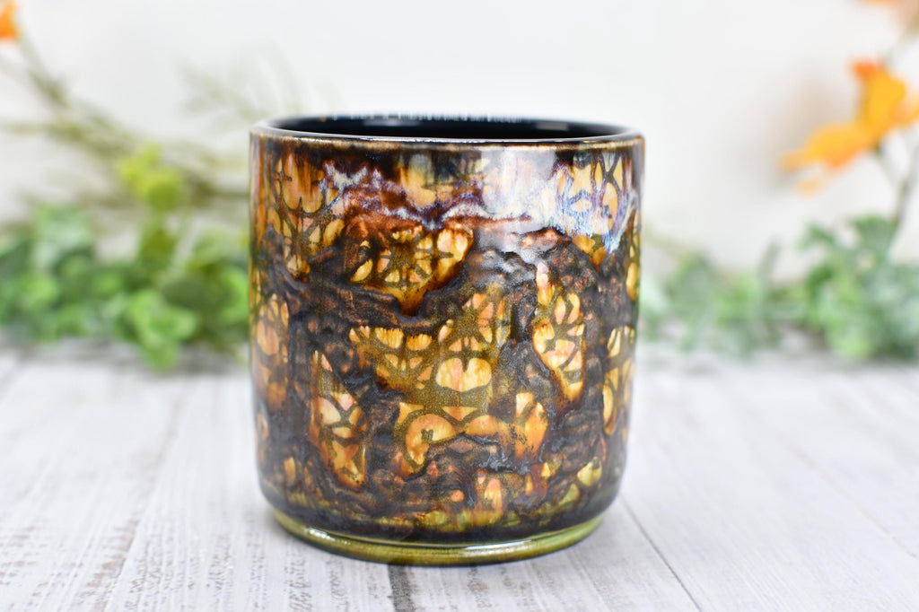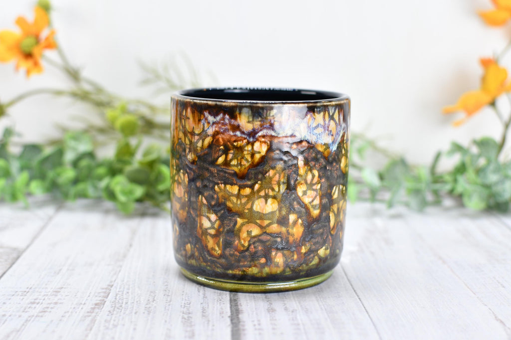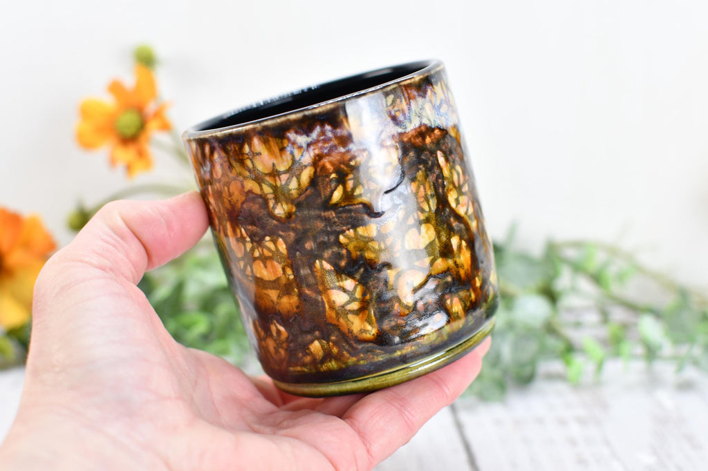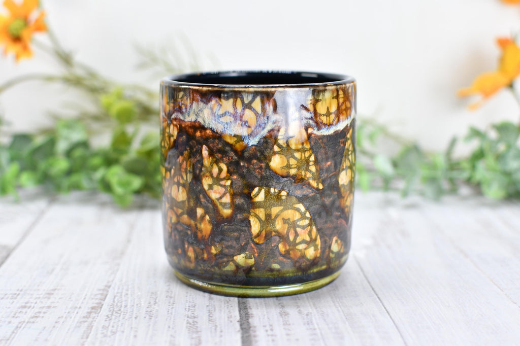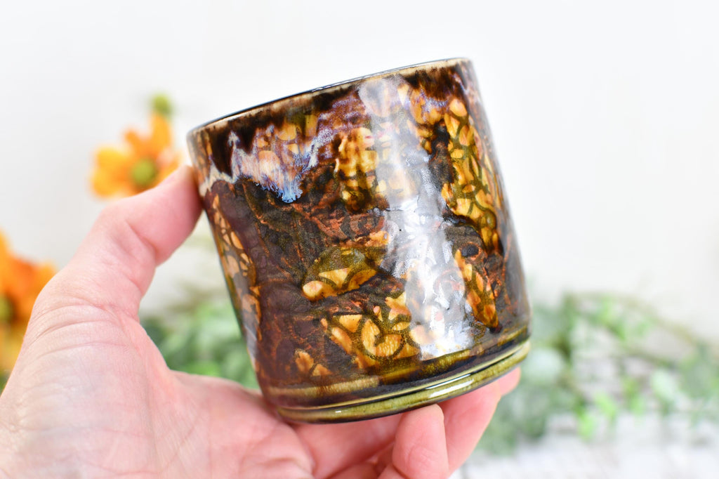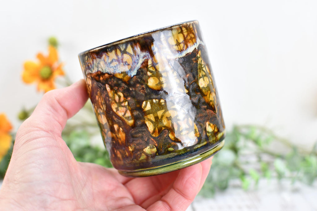 Materials: lead free non toxic food safe glaze, microwave and dishwasher safe, hand wash recommended, kitchen dining drink barware home, functional kiln fired ceramics, packaged well woman owned small business, fast shipping made in austin Texas USA, drippy earthy green bronze tan orange, wine whiskey bathroom barware juice, handmade wheel thrown pottery, screen printed clay unique boho design, screen printed patterns one of a kind, 11 ounce capacity drink beverage.