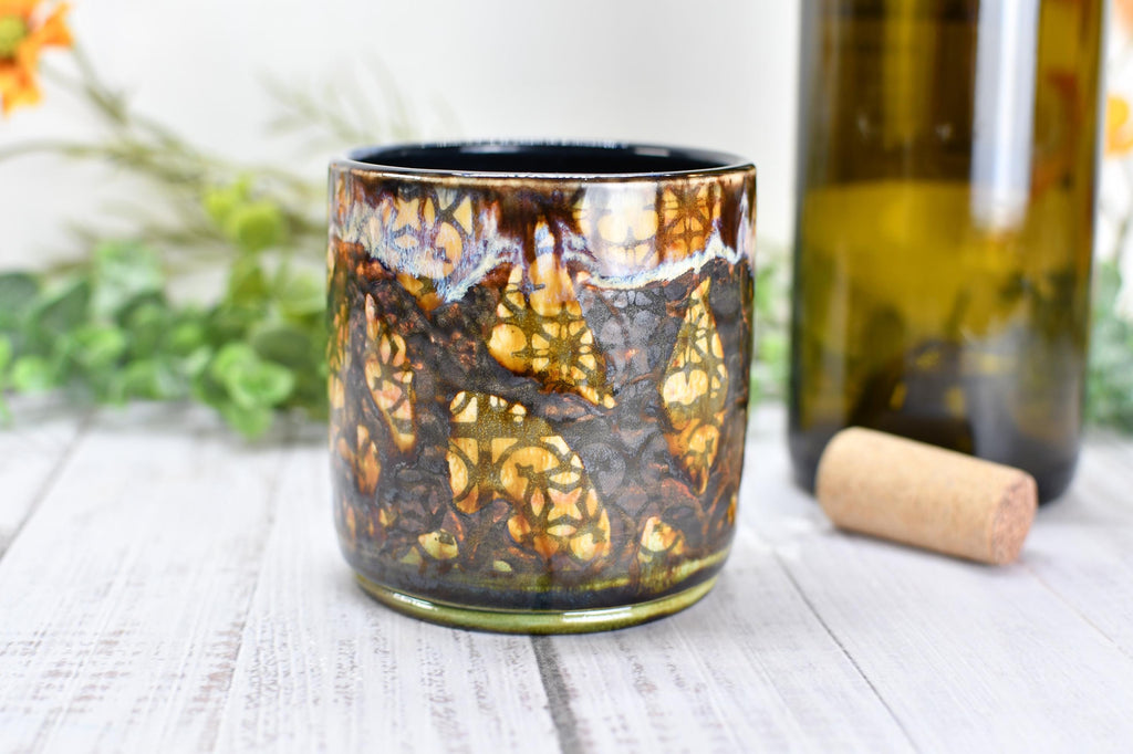 Whiskey Bourbon Cup, Bronze Pottery Anniversary Handmade Ceramic Tumbler BoHo Art Lover Wine Gift, Black, Olive Green, Tan Moroccan Pattern
