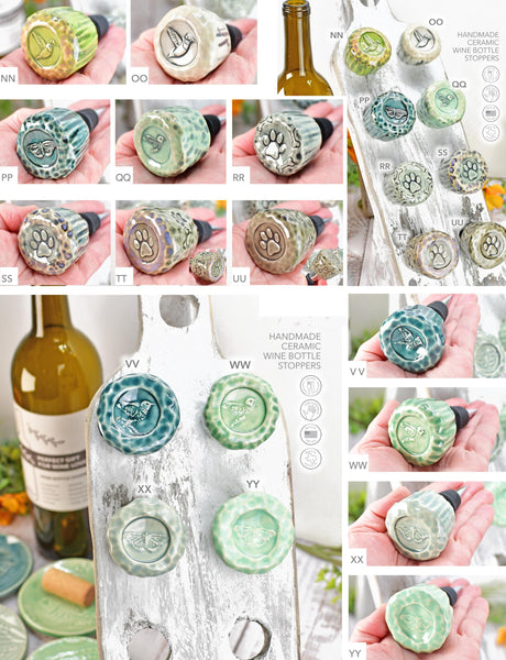 My handmade stoneware wine bottle stoppers make unique housewarming, birthday, and Christmas gifts for her or him. Each bottle stopper is formed by hand, hand carved or hand stamped with my original designs. I hand painted with lead-free, non-toxic glaze. A functional piece of ceramic pottery is a perfect stocking stuffer, package topper, or original present for wine lovers.