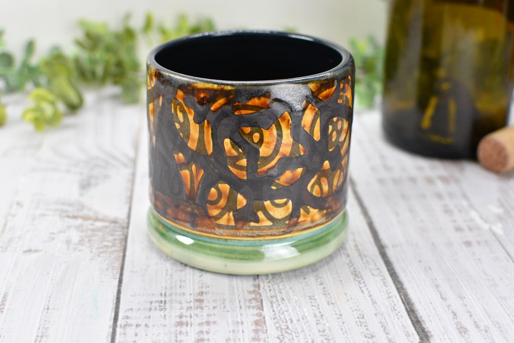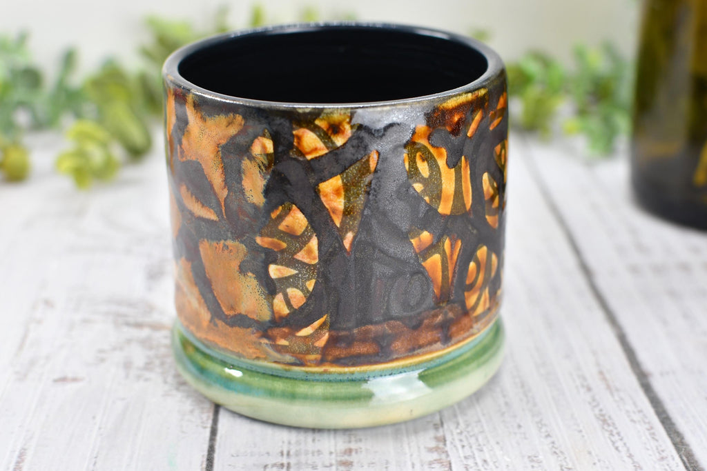 Bronze Whiskey Bourbon Cup, Pottery Anniversary Handmade Ceramic Tumbler Barware Wine Gift, Black, Green, Tan Mediterranean Moroccan SECONDS