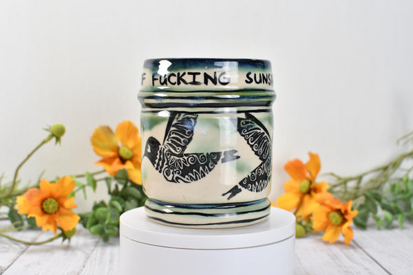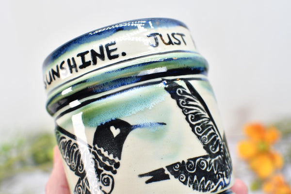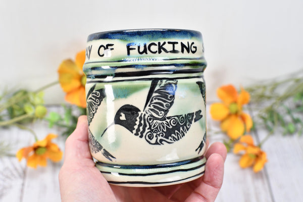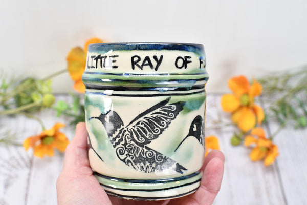 Hummingbird Handmade Pottery Tumbler Cup, Funny Sarcastic Little Ray of Fucking Sunshine Ceramic Handleless Coffee Gift, Stoneware, Microwave Safe