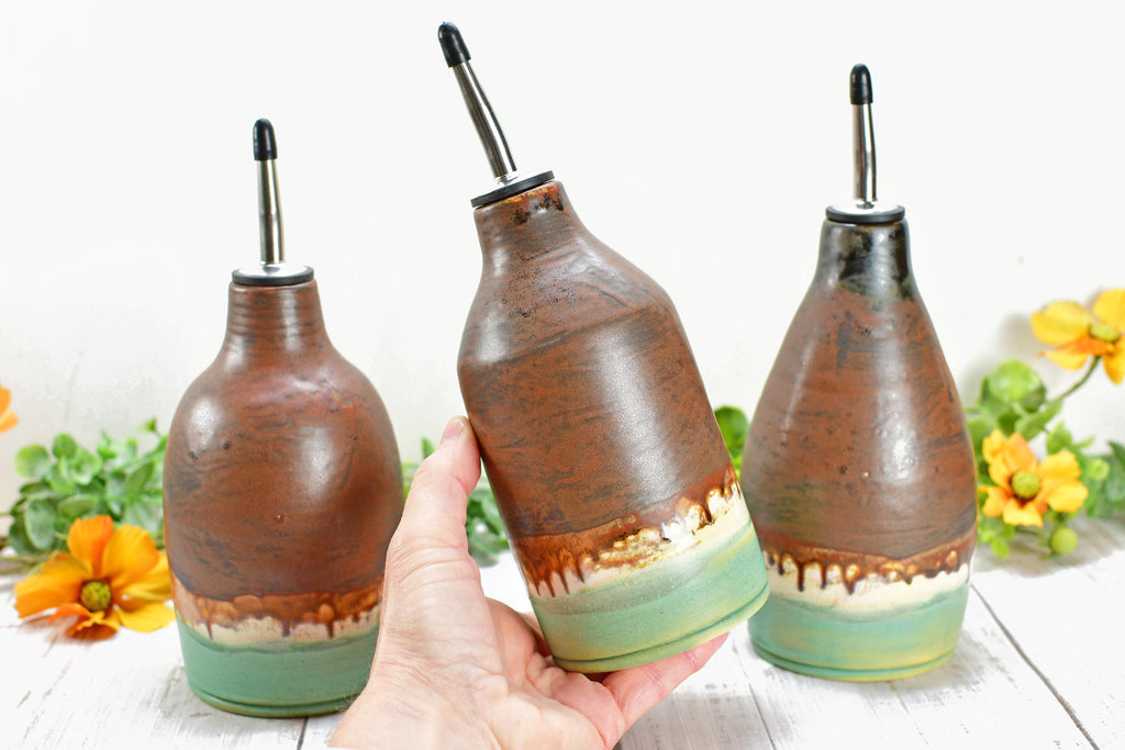 Ceramic Olive Oil Dispenser, Handmade Pottery Liquid Soap Bottle, Stoneware Bronze, Copper, Rust, Turquoise for Bathroom and Kitchen Decor
