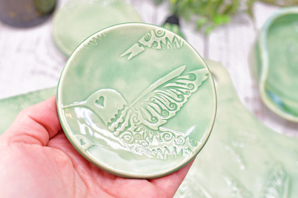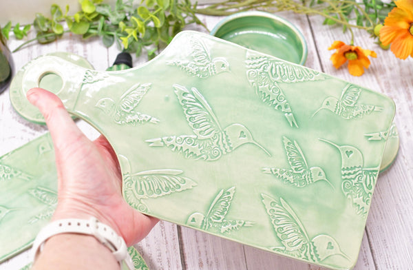Elevate your home entertaining with beautiful hummingbird stamped pottery charcuterie plate, slab/flat spoon rest, coffee spoon rest/trinket dish, or large circular spoon rest. Each of my handmade, slab-built celadon mint green stoneware pottery dishes will make a classy addition to your kitchen, dining, and home decor. The circular stoneware spoon rest is perfect for stovetop and is wheel thrown.