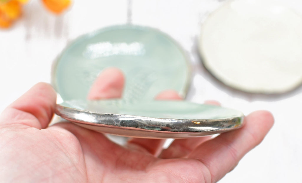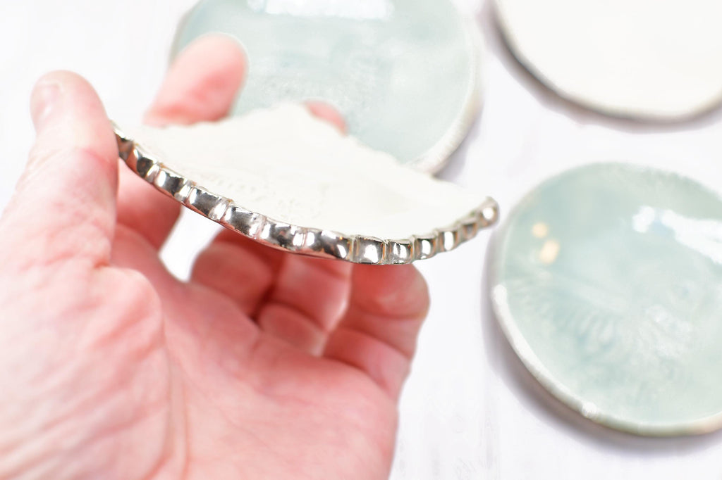 Once the clay is bone dry, I fire to bisque in my small home studio kiln. Bisque firing takes about 8+ hours. Once the bisque firing is complete, the final glaze is hand painted, allowed to dry, and then fired again in the final stage (another 8+ hours). Finally, the real white gold lustre is hand painted, allowed to dry for several hours, and is then fired for the third time. The final metallic glaze fire takes about 5+ hours.