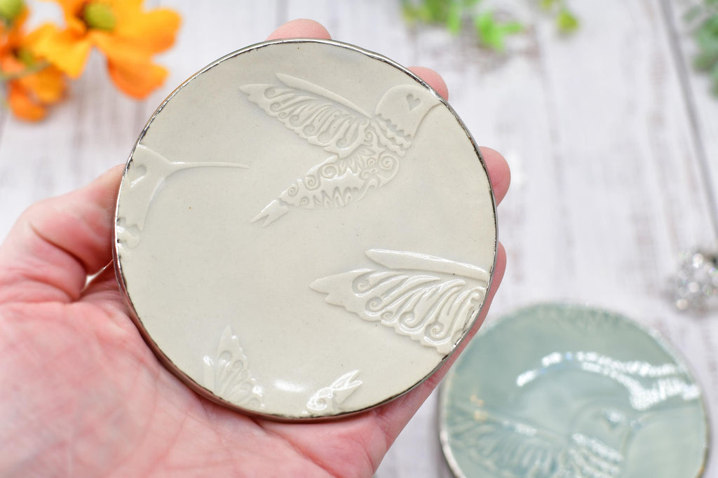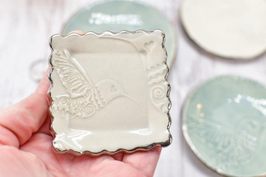 My original hummingbird design is imprinted into stoneware clay on these handmade, slab built, stoneware dishes. Each piece is hand painted with real white gold lustre glaze around the rim. It is perfect for use as a trinket bowl for engagement and wedding rings, earrings, jewelry, or even as a tea bag rest, pill dish, or as a spoon rest for coffee and tea lovers. Gift this unique piece for engagement celebrations or wedding gifts.