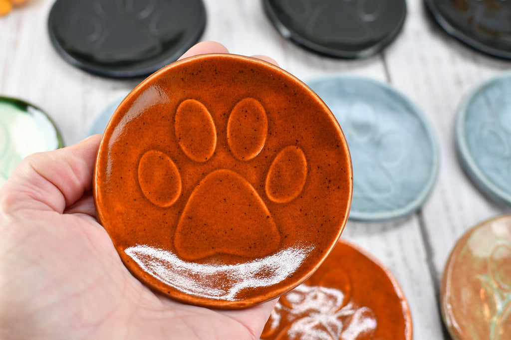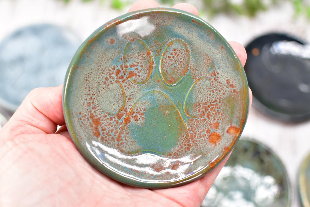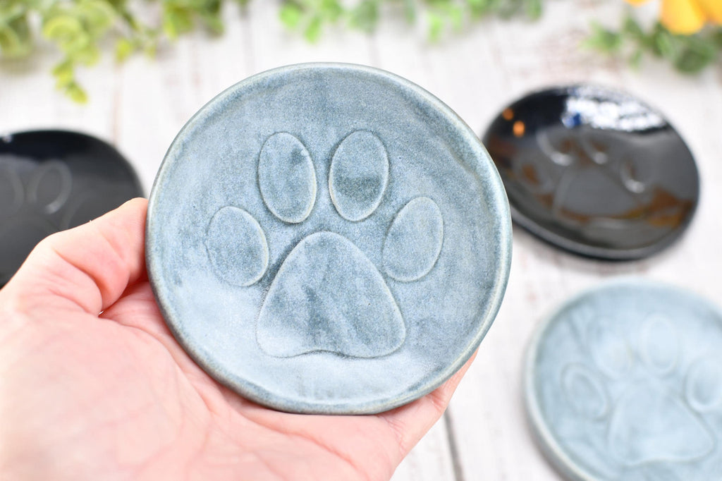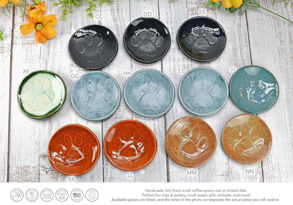 My dog paw print design is imprinted into wet clay on each of my small, handmade stoneware dishes. Use as a trinket bowl for earrings and jewelry, tea bag rest, pill dish, or as a mini spoon rest for coffee lovers. Each is handmade and is functional ceramic pottery, and is a unique gift for the pet cat, dog, or animal lover in your life.