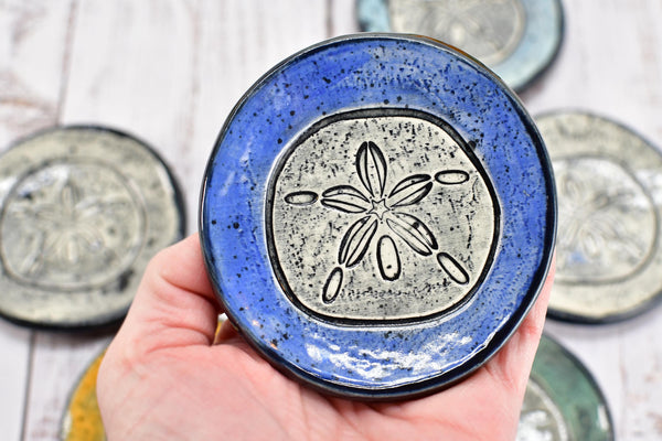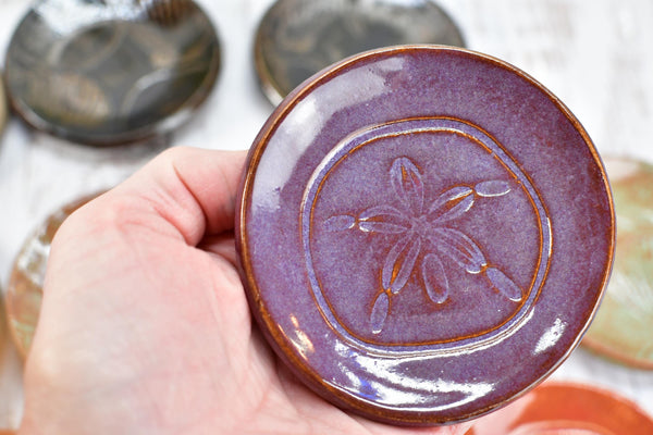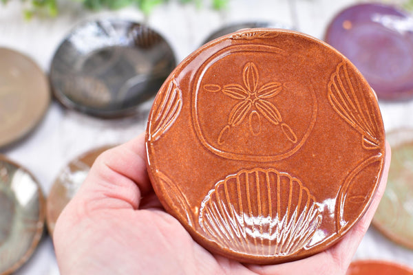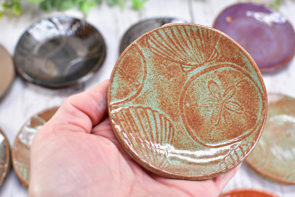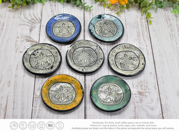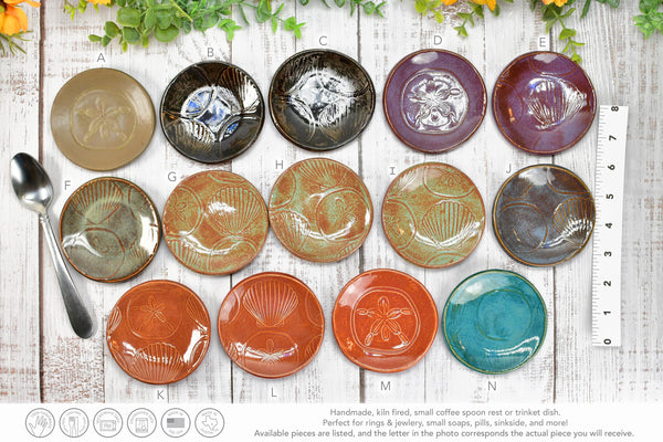 My small, ocean-themed spoon rest / trinket dishes are 100% handmade and are functional ceramic pottery. Perfect for use as coffee spoon rest, tea bag rest, jewelry/ring dish, or for pills and trinkets. These small spoon rests feature my own hand drawn seashell and sand dollar stamp imprint designs.