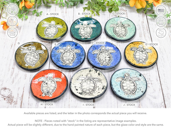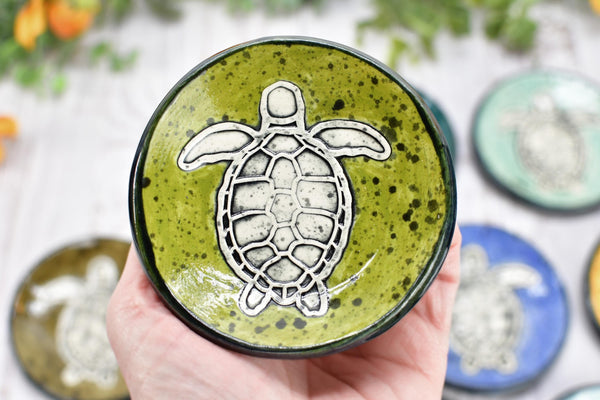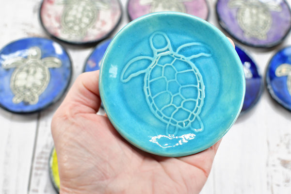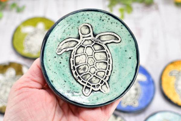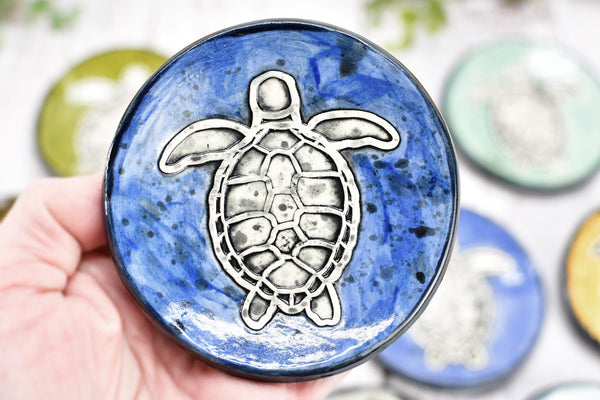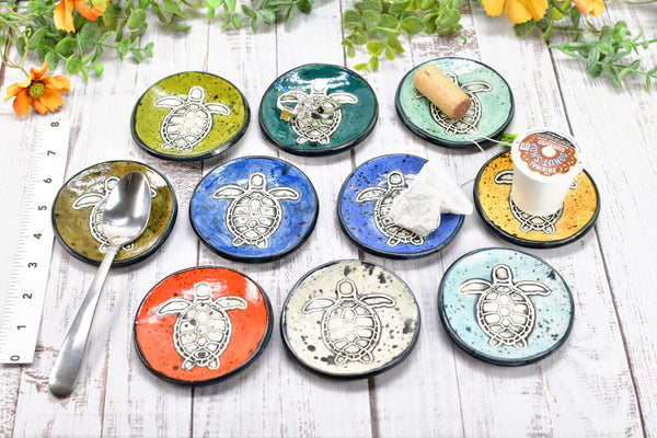 My small, sea turtle ocean-themed spoon rest / trinket dishes are 100% handmade and are functional ceramic pottery. Perfect for use as coffee spoon rest, tea bag rest, jewelry/ring dish, or for pills and trinkets. These small spoon rests feature my own hand drawn sea turtle design and stamped as a tactile imprint.