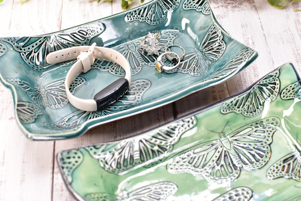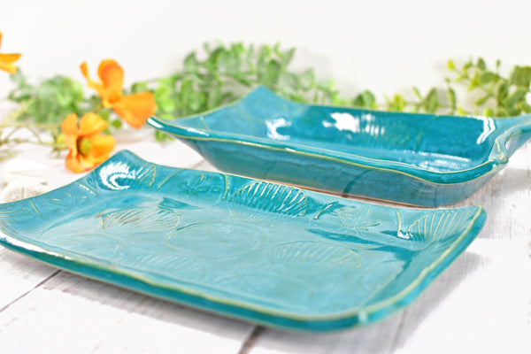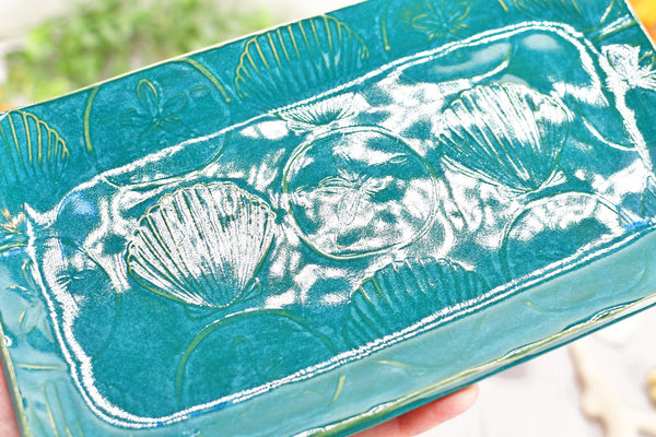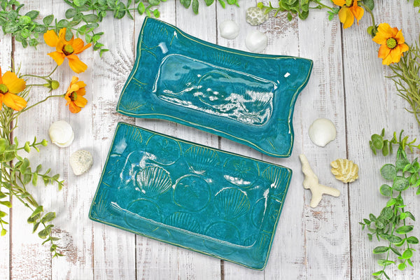 My handmade, slab-built turquoise blue green stoneware pottery dishes will make a classy addition to your kitchen dining, and home decor. These ceramic pieces are hand stamped with seashell and sand dollar images. A functional ceramic pottery piece will make a beautiful gift for housewarming, Mother’s Day, birthday, Christmas, wedding, and more!