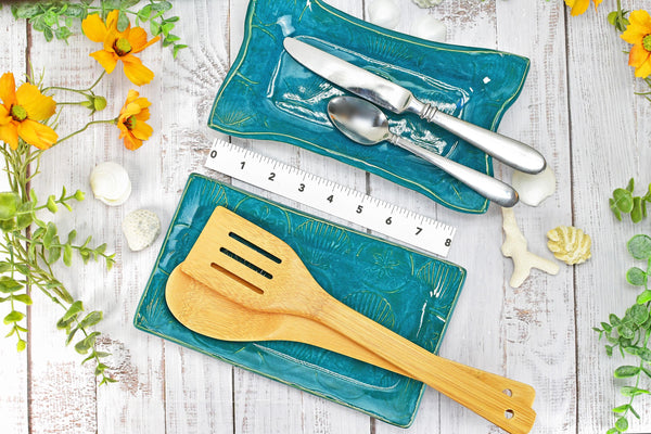 Materials: dishwasher and microwave safe, non toxic food safe glaze, lead free ceramic, handmade one of a kind, made in the usa, ready to ship fast, kitchen and dining serving decor, slab built stoneware pottery, long stick butter holder two piece dish, jewelry ring watch catchall dish, spoon rest scalloped edge, seashell sand dollar pattern kiln fired, turquoise blue green with shells.