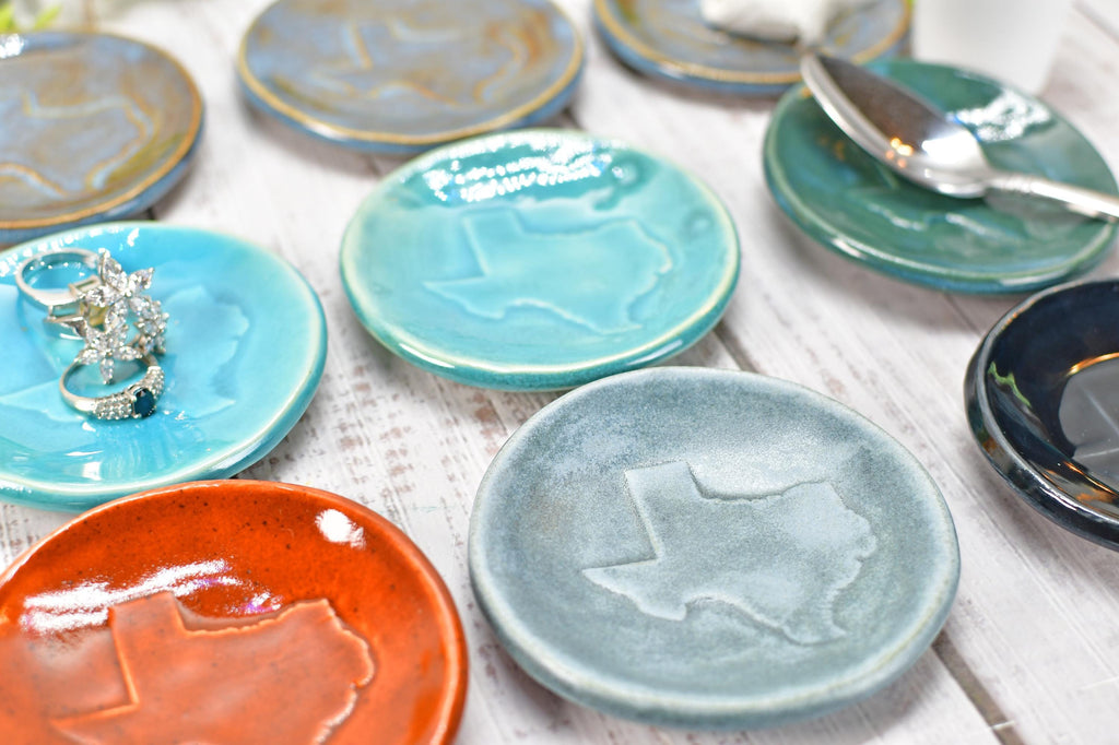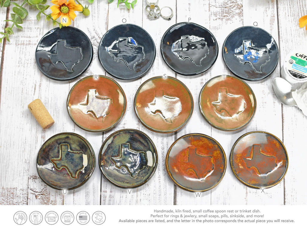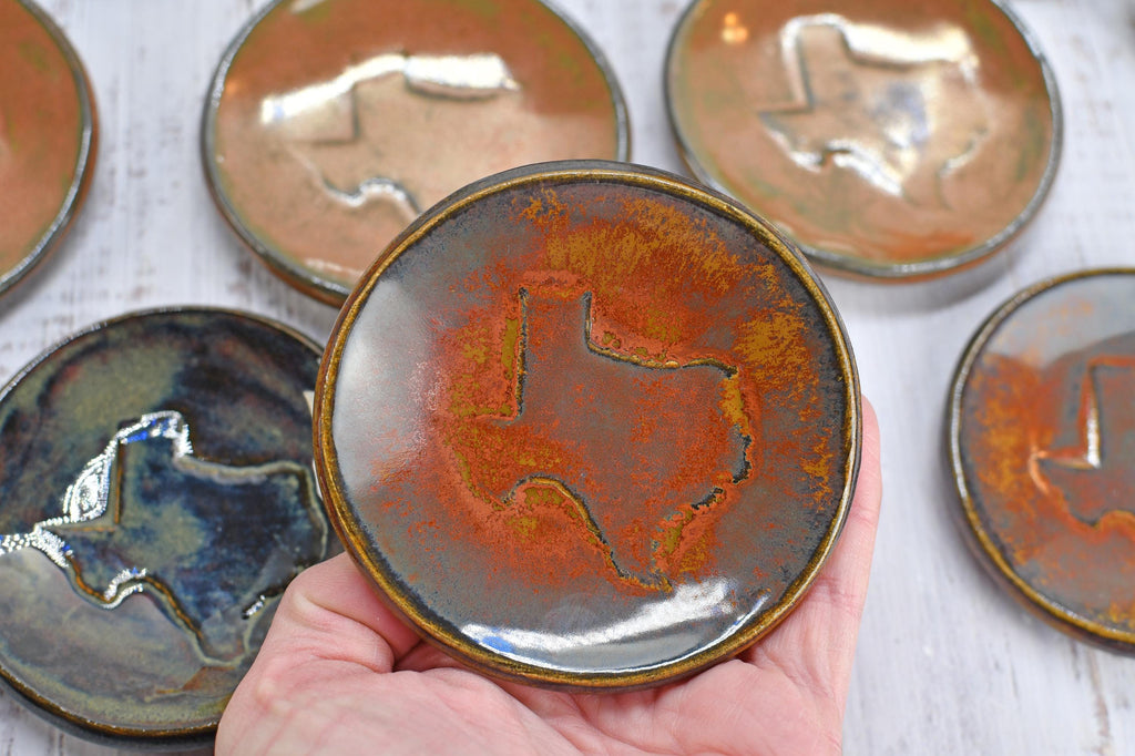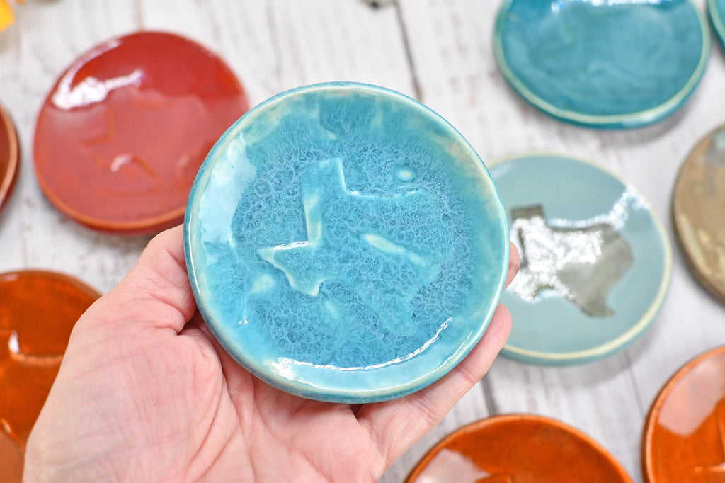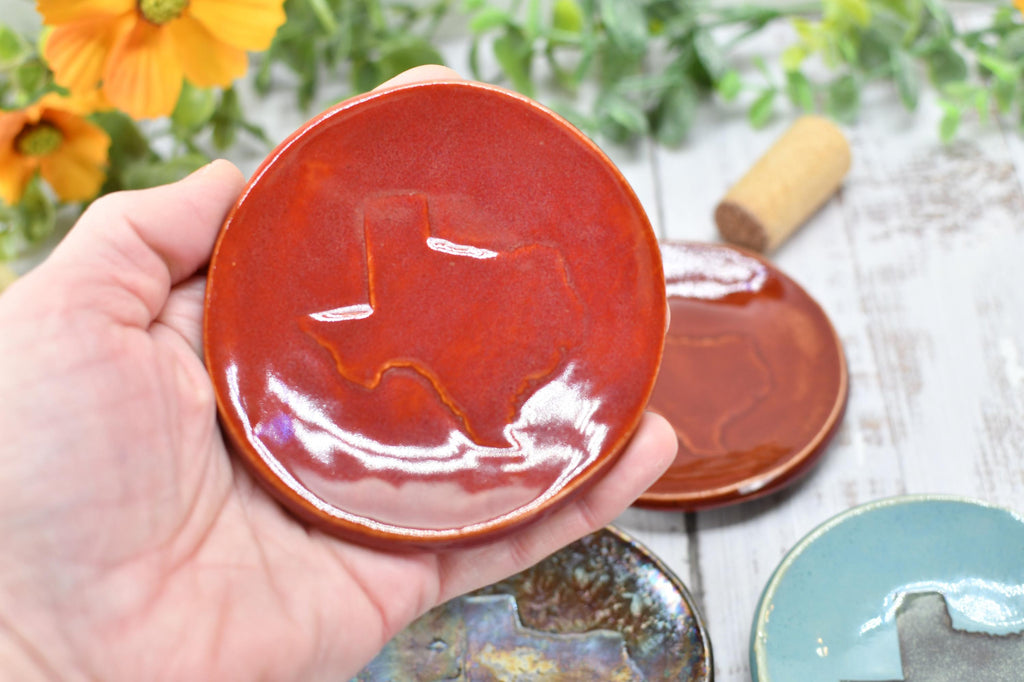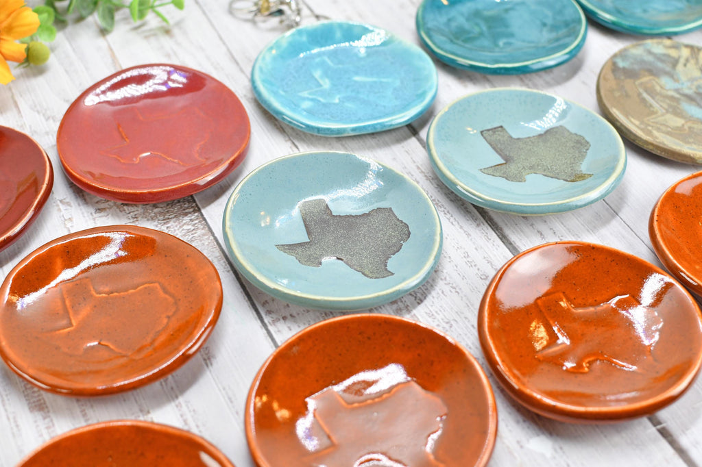 The Lone Star State of Texas is imprinted into wet clay on each of my small, handmade stoneware dishes. Use as a trinket bowl for earrings and jewelry, tea bag rest, pill dish, or as a mini spoon rest for coffee and tea lovers. Perfect for college dorm gifts, and back to school university Texas pride. Also makes a great drip tray for placing under box wine holder spouts. Each is handmade, hand painted, and is functional ceramic pottery.