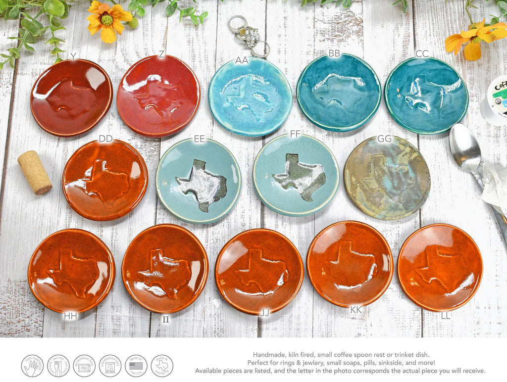 Texas Ceramic Small Coffee Spoon Rest Gift, Handmade Jewelry Trinket Dish, Stoneware Pottery, Orange, Blue, Turquoise, Brown, Green, Black
