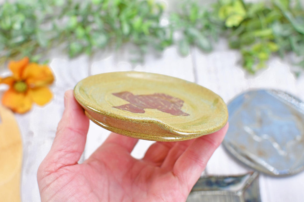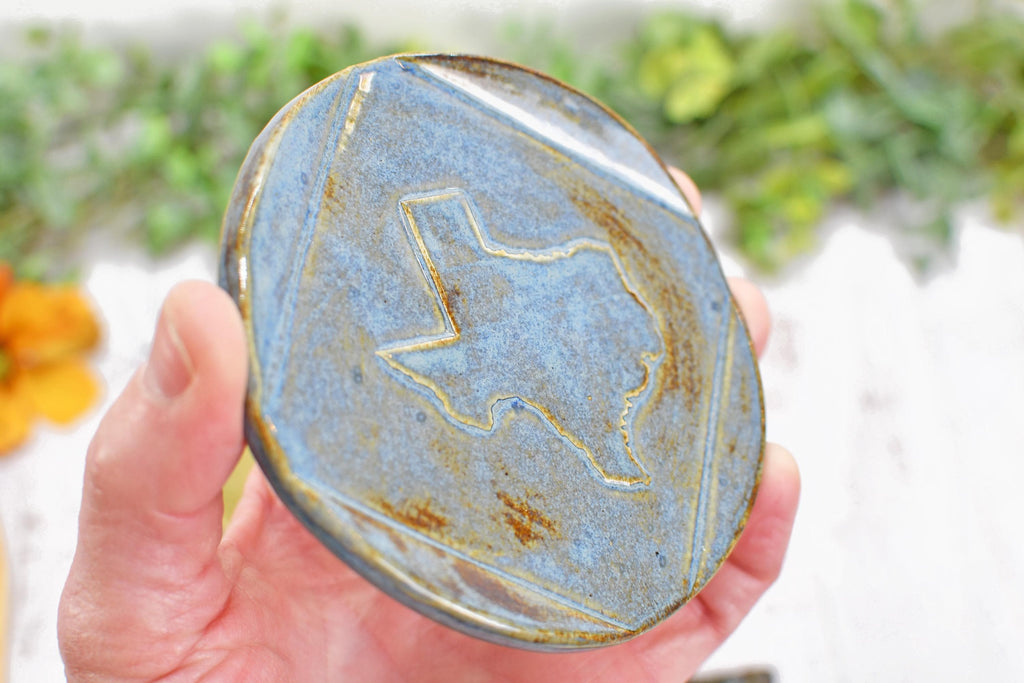 The Lone Star State of Texas is kiln-fired onto each of my handmade stoneware dishes. Use as a trinket bowl for earrings and jewelry, tea bag rest, pill dish, or as a spoon rest for coffee and tea lovers. Perfect for college dorm gifts, and back to school university Texas pride. Each is handmade, hand painted with glaze, and is functional ceramic pottery.