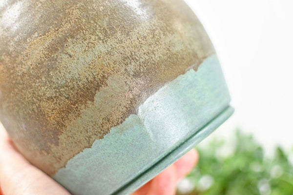 Materials: dishwasher and microwave safe, non toxic food safe glaze, lead free ceramic, fast shipping, handmade one of a kind, kiln fired pot, wheel thrown stoneware pottery, drippy rustic glaze, heavy weight and heavy duty, kitchen and dining organization and decor, made in the usa, bronze brown black and sage green glazes, 6 plus inches tall 5 and a half inches wide.