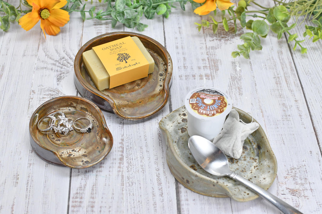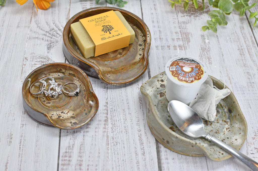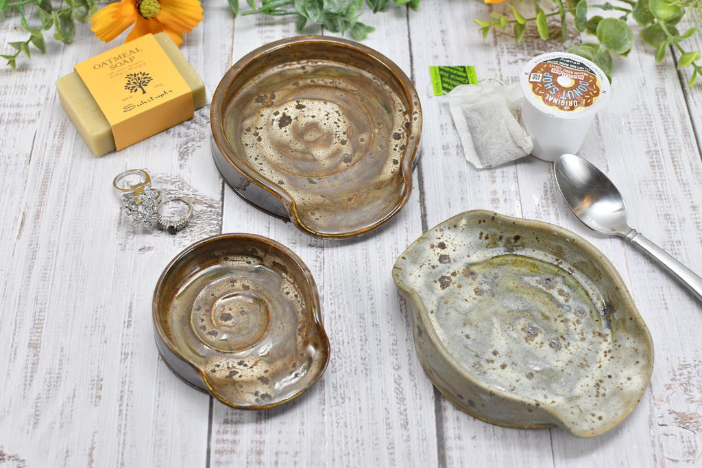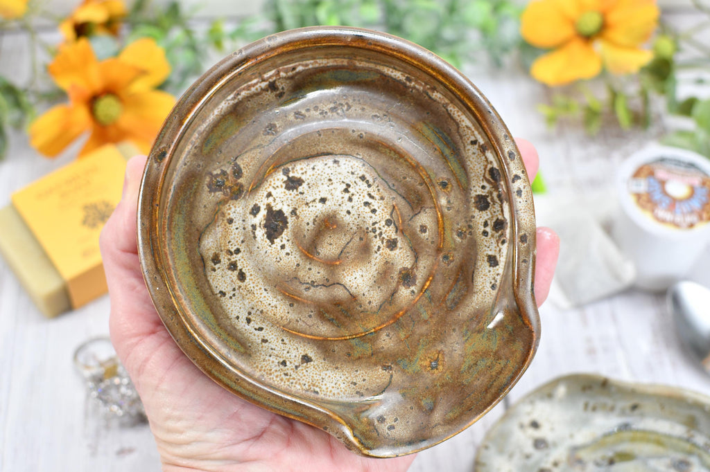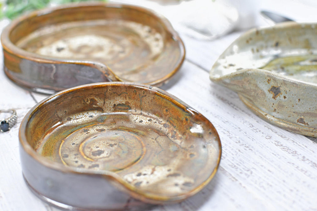 My rustic brown and cream wheel-thrown spoon rest dishes are 100% handmade and are functional ceramic pottery. Perfect for use as tabletop or stovetop spoon rest, coffee and tea bar, soap dish, trinket dish, and more.