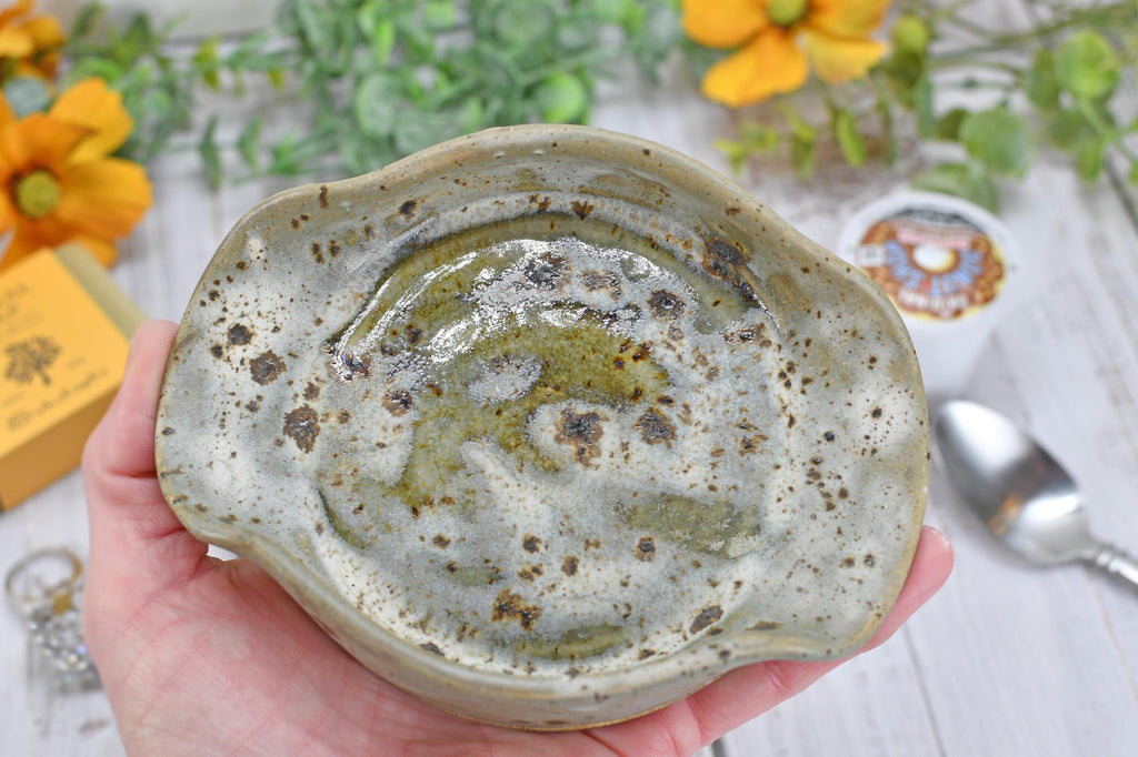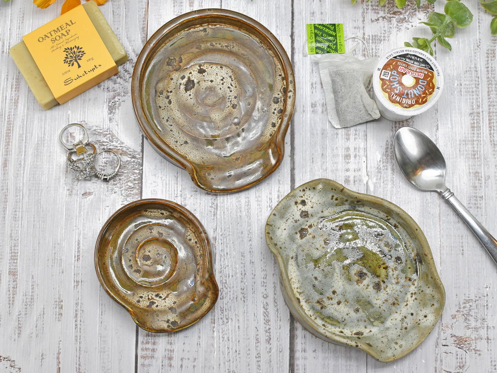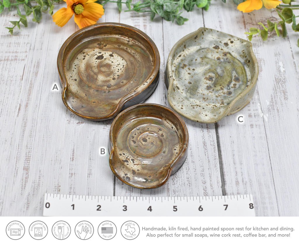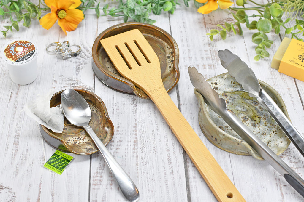 My rustic brown and cream wheel-thrown spoon rest dishes are 100% handmade and are functional ceramic pottery. Perfect for use as tabletop or stovetop spoon rest, coffee and tea bar, soap dish, trinket dish, and more.