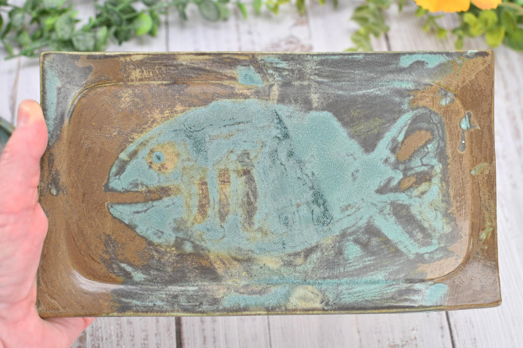 Materials: hand painted pottery, made in austin texas USA, microwave and dishwasher safe, food safe lead free non toxic glaze, slab built pottery bowls with fish motif, bowl plate dining serving one of a kind, brown tan gray blue green teal ocean, artisan rectangle circle artistic touch, stoneware handmade ceramics kiln fired, wrapped with care ready to ship fast, flat matte earthy glaze with nautical design, rustic dining home decor serving party tray, fruit tabletop counter spoon rest.