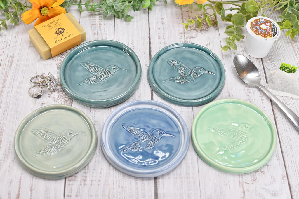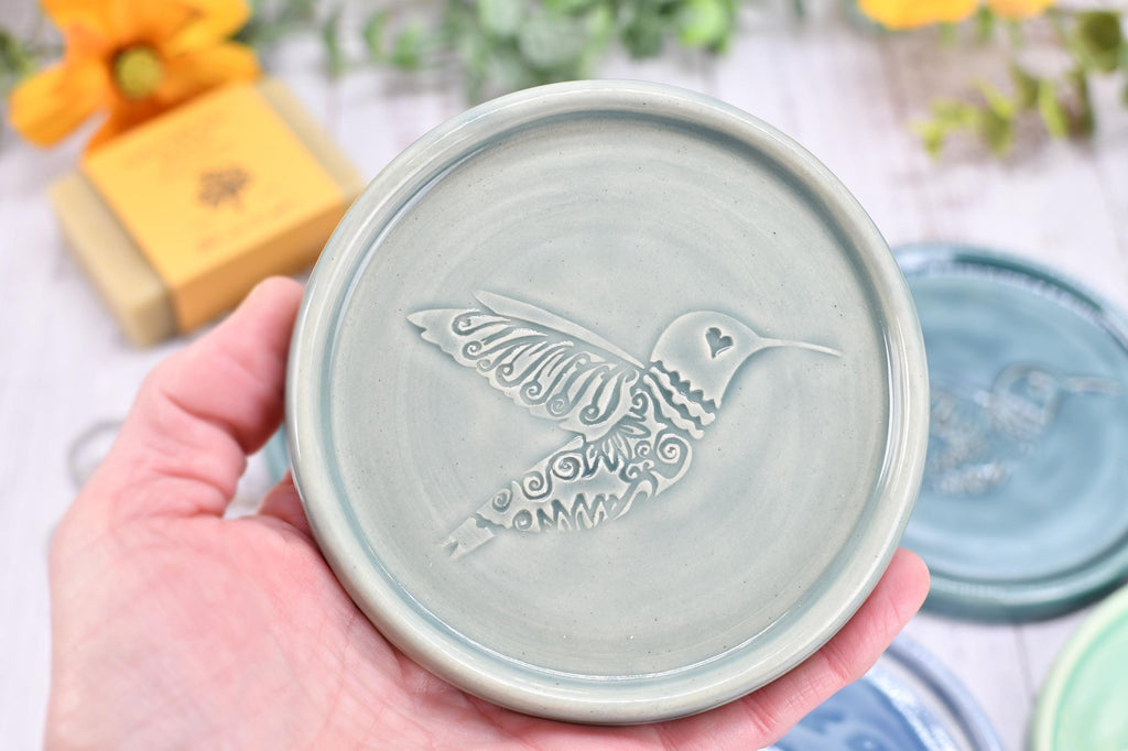 Hummingbird Ceramic Spoon Rest, Medium Flat Handmade Stoneware Stove Top Pottery in Blue, Gray, Green - Trinket Dish Housewarming Gift